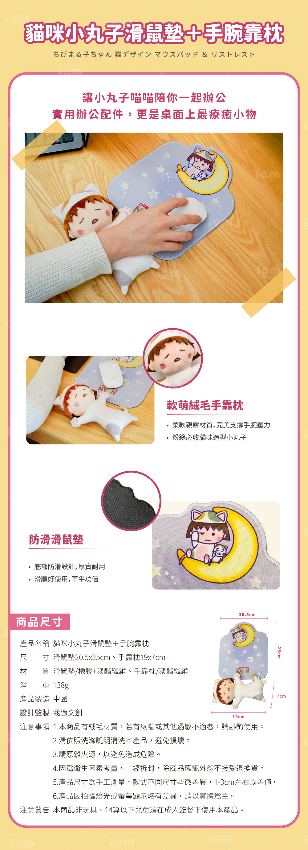 超萌「櫻桃小丸子貓咪造型」滑鼠墊與手靠枕,不僅是實用的辦公配件,更是桌面上最療癒的風景。