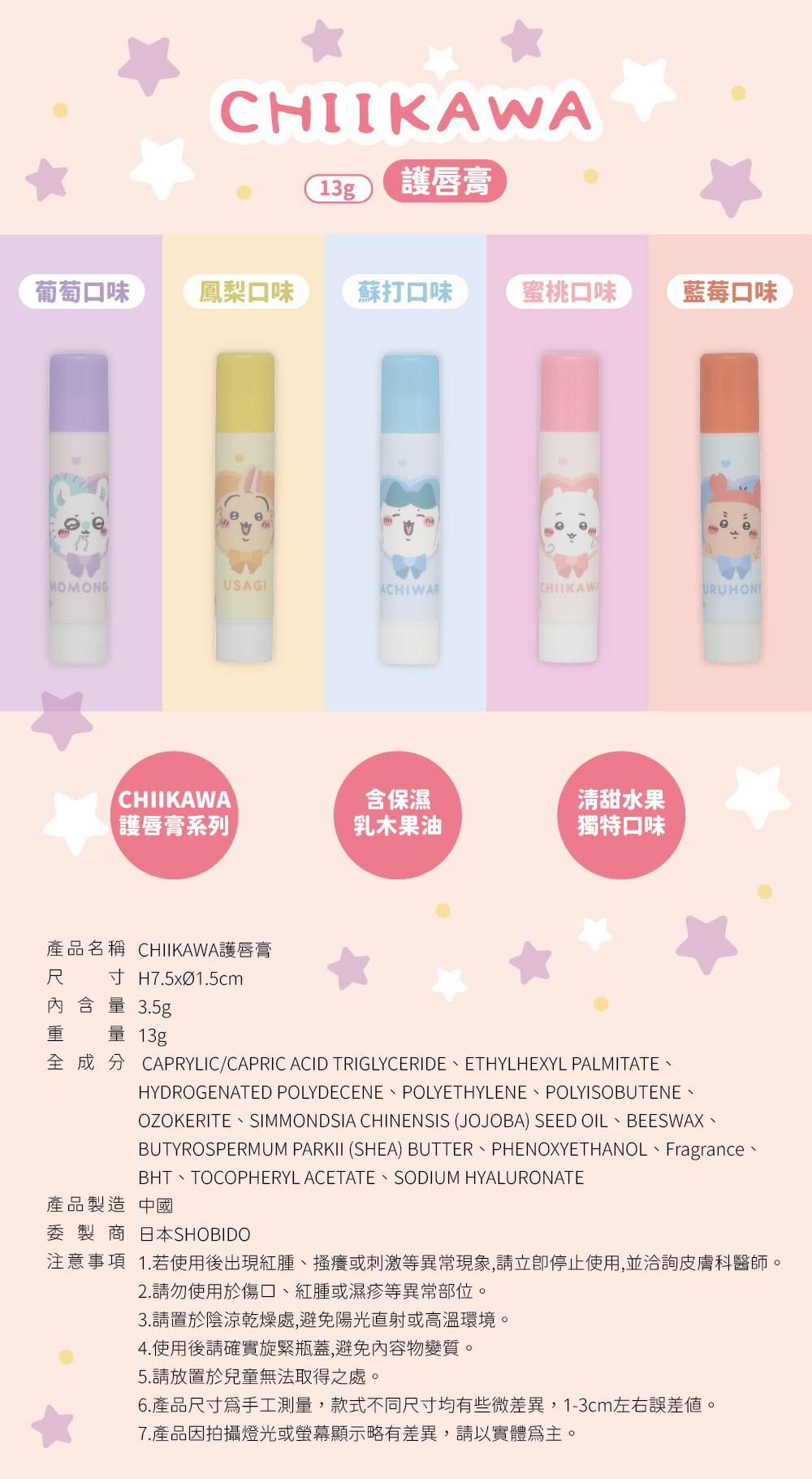 每一款護唇膏都有專屬角色圖案與可愛設計,是Chiikawa粉絲絕對不能錯過的周邊收藏品!